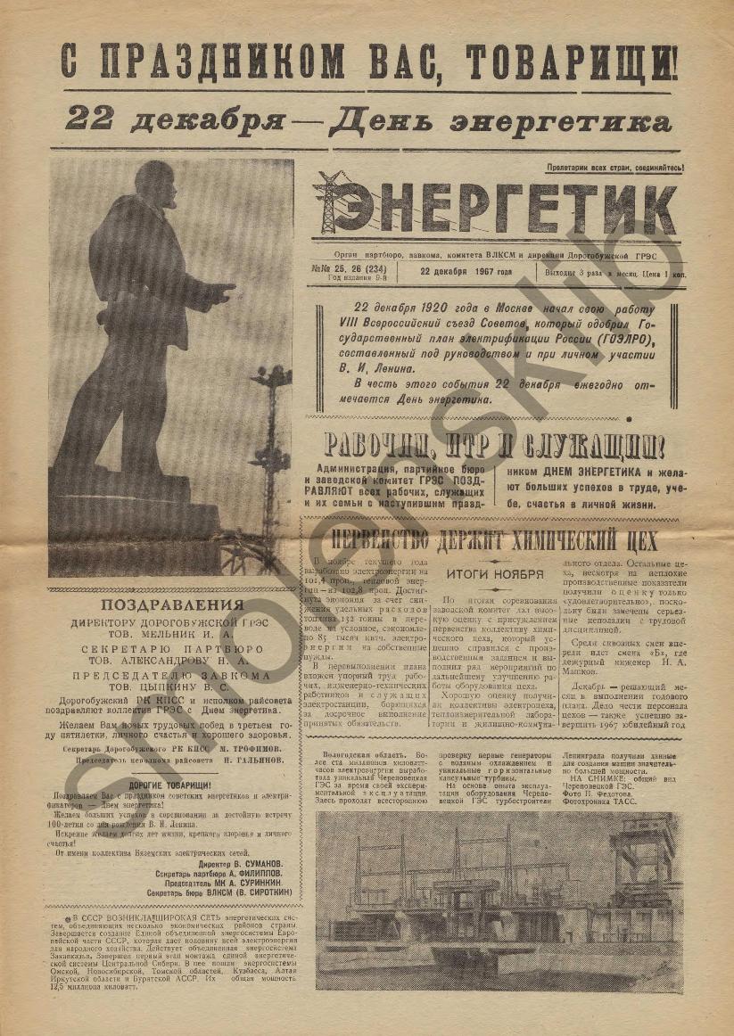 Энергетик: Орган партбюро, завкома, комитета ВЛКСМ и дирекции Дорогобужской ГРЭС. — Сафоново: Сафоновская тип., 1958-____. № 25, 26.