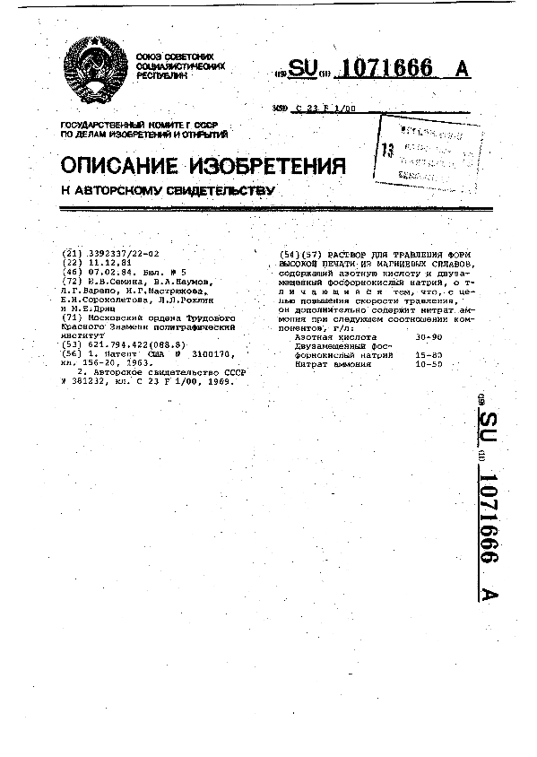 Раствор для травления форм высокой печати из магниевых сплавов / Семина Е. В., Наумов В. А., Варепо Л. Г. [и др.]; заявитель: Московский ордена Трудового Красного Знамени полиграфический институт // Описания изобретений (ретрофонд) / Комитет по патентам и товарным знакам России. – М. — (Патенты России)., 2003. – 1984, № 1. — Загл. с титул. экрана. — Поисковая система: ИПС MIMOSA GTI. — Систем. требования: Acrobat Reader. — Режим доступа: ftp://smolensklib.ru/bd/patent_ru/pt1071666.pdf. — <URL:ftp://smolensklib.ru/bd/patent_ru/pt1071666.pdf>.