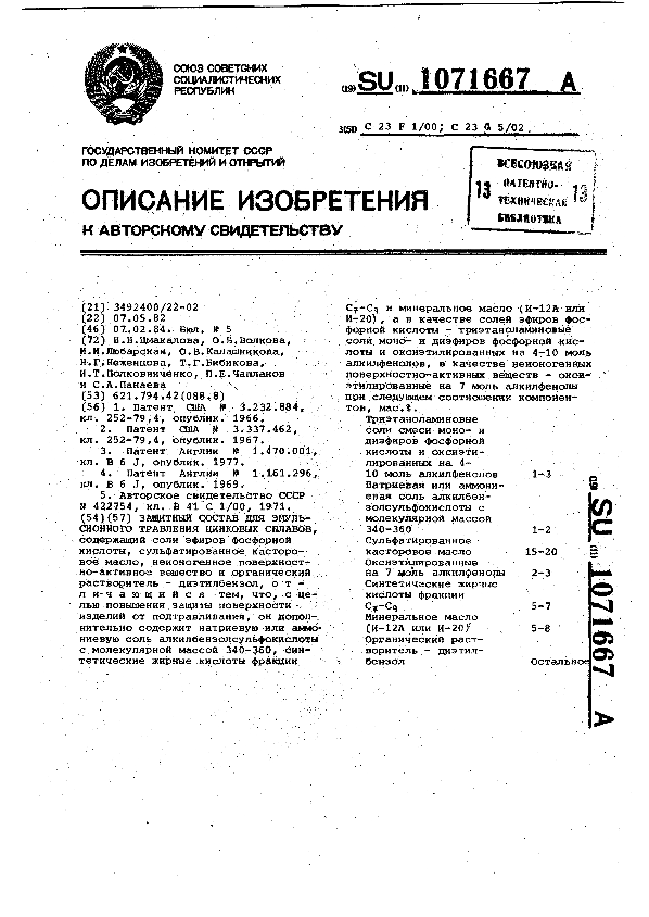 Защитный состав для эмульсионного травления цинковых сплавов / Цмакалова Н. Н., Волкова О. Б., Любарская И. И. [и др.] // Описания изобретений (ретрофонд) / Комитет по патентам и товарным знакам России. – М. — (Патенты России)., 2003. – 1984, № 1. — Загл. с титул. экрана. — Поисковая система: ИПС MIMOSA GTI. — Систем. требования: Acrobat Reader. — Режим доступа: ftp://smolensklib.ru/bd/patent_ru/pt1071667.pdf. — <URL:ftp://smolensklib.ru/bd/patent_ru/pt1071667.pdf>.