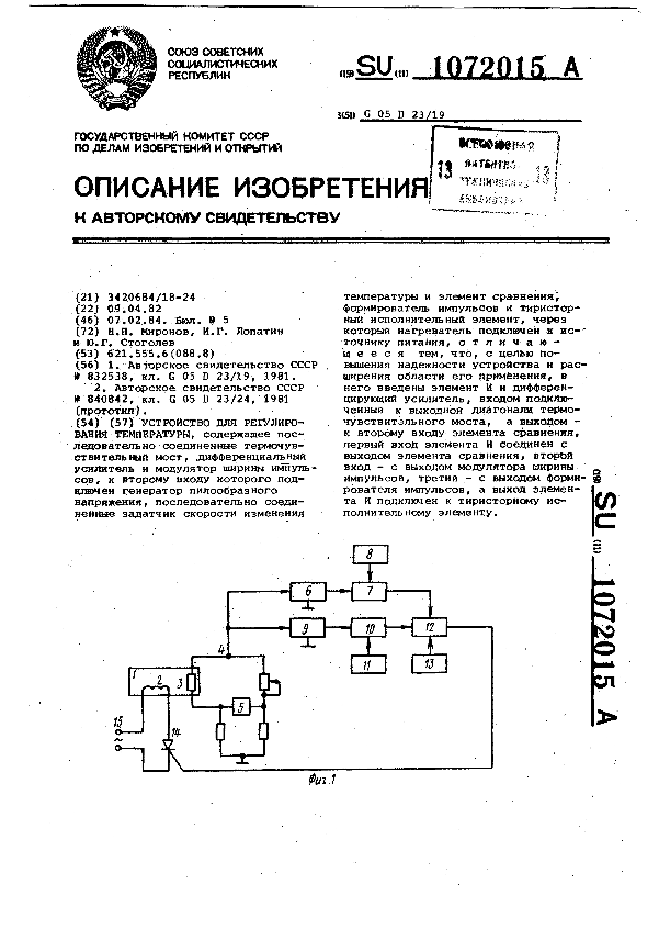 Устройство для регулирования температуры / Миронов Н. П., Лопатин И. Г., Стоголев Ю. Г. // Описания изобретений (ретрофонд) / Комитет по патентам и товарным знакам России. – М. — (Патенты России)., 2003. – 1984, № 1. — Загл. с титул. экрана. — Систем. требования: Acrobat Reader. — Режим доступа: ftp://smolensklib.ru/bd/patent_ru/pt1072015.pdf. — <URL:ftp://smolensklib.ru/bd/patent_ru/pt1072015.pdf>.