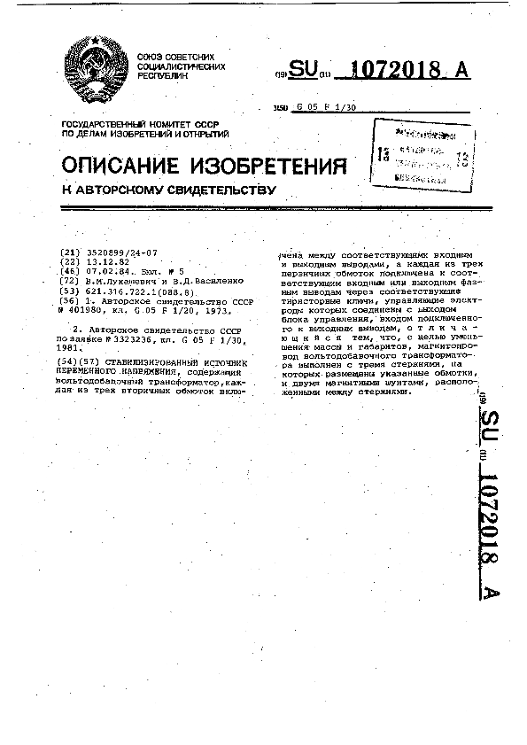 Стабилизированный источник переменного напряжения / Лукашевич В. М., Василенко В. Д. // Описания изобретений (ретрофонд) / Комитет по патентам и товарным знакам России. – М. — (Патенты России)., 2003. – 1984, № 1. — Загл. с титул. экрана. — Систем. требования: Acrobat Reader. — Режим доступа: ftp://smolensklib.ru/bd/patent_ru/pt1072018.pdf. — <URL:ftp://smolensklib.ru/bd/patent_ru/pt1072018.pdf>.
