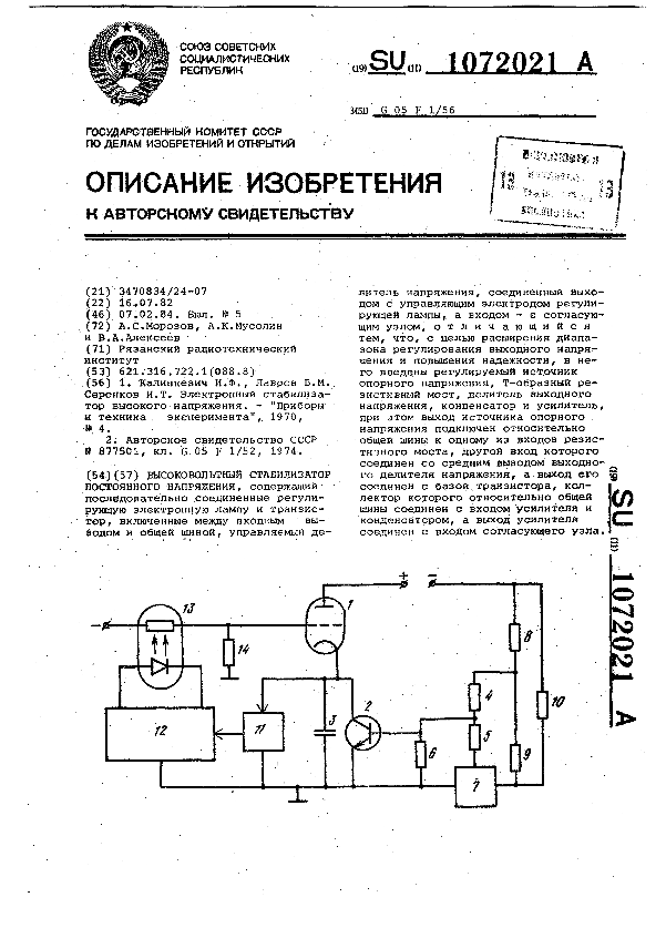Высоковольтный стабилизатор постоянного напряжения / Морозов А. С., Мусолин А. К., Алексеев В. А.; заявитель: Рязанский радиотехнический институт // Описания изобретений (ретрофонд) / Комитет по патентам и товарным знакам России. – М. — (Патенты России)., 2003. – 1984, № 1. — Загл. с титул. экрана. — Систем. требования: Acrobat Reader. — Режим доступа: ftp://smolensklib.ru/bd/patent_ru/pt1072021.pdf. — <URL:ftp://smolensklib.ru/bd/patent_ru/pt1072021.pdf>.