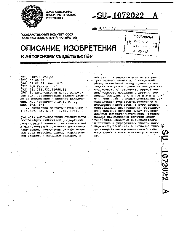Высоковольтный стабилизатор постоянного напряжения / Кадель В. И. // Описания изобретений (ретрофонд) / Комитет по патентам и товарным знакам России. – М. — (Патенты России)., 2003. – 1984, № 1. — Загл. с титул. экрана. — Систем. требования: Acrobat Reader. — Режим доступа: ftp://smolensklib.ru/bd/patent_ru/pt1072022.pdf. — <URL:ftp://smolensklib.ru/bd/patent_ru/pt1072022.pdf>.