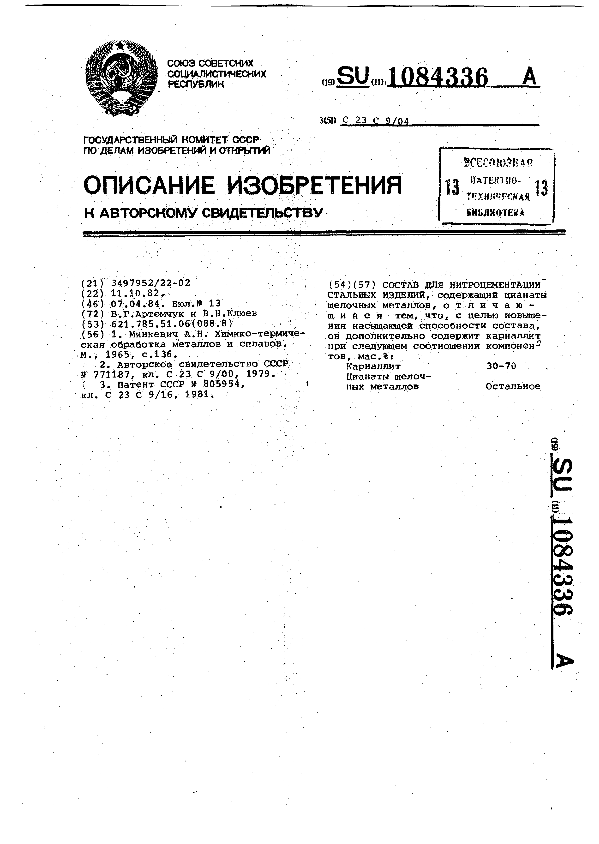 Состав для нитроцементации стальных изделий / Артемчук В. Г., Клюев В. Н. // Описания изобретений (ретрофонд) / Комитет по патентам и товарным знакам России. – М. — (Патенты России)., 2003. – 1984, № 1. — Загл. с титул. экрана. — Систем. требования: Acrobat Reader. — Режим доступа: ftp://smolensklib.ru/bd/patent_ru/pt1084336.pdf. — <URL:ftp://smolensklib.ru/bd/patent_ru/pt1084336.pdf>.