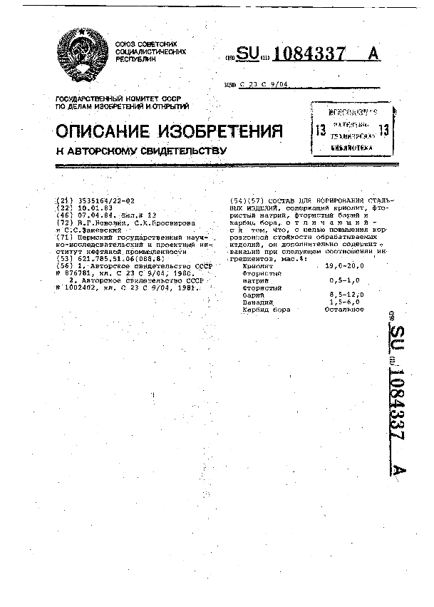 Состав для борирования стальных изделий / Неволин В. Г., Просвирова С. К., Заневский С. С.; заявитель : Пермский государственный научно-исследователъский и проектный институт нефтяной промышленности // Описания изобретений (ретрофонд) / Комитет по патентам и товарным знакам России. – М. — (Патенты России)., 2003. – 1984, № 1. — Загл. с титул. экрана. — Систем. требования: Acrobat Reader. — Режим доступа: ftp://smolensklib.ru/bd/patent_ru/pt1084337.pdf. — <URL:ftp://smolensklib.ru/bd/patent_ru/pt1084337.pdf>.