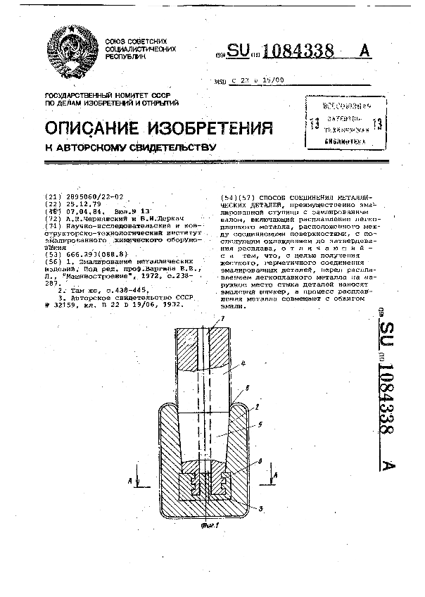 Способ соединения металлических деталей / Чернявский А. Н., Деркач В. И.; заявитель : Научно-исследовательский и конструкторско-технологический институт эмалированного химического оборудования // Описания изобретений (ретрофонд) / Комитет по патентам и товарным знакам России. – М. — (Патенты России)., 2003. – 1984, № 1. — Загл. с титул. экрана. — Систем. требования: Acrobat Reader. — Режим доступа: ftp://smolensklib.ru/bd/patent_ru/pt1084338.pdf. — <URL:ftp://smolensklib.ru/bd/patent_ru/pt1084338.pdf>.