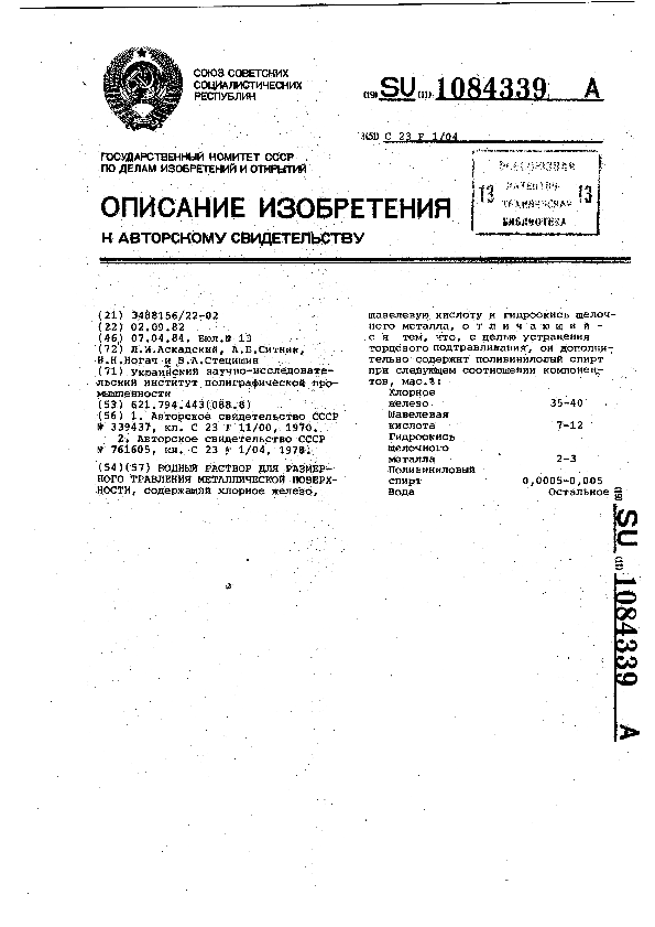 Водный раствор для размерного травления металлической поверхности / Аскадский Л. И., Ситник А. Б., Ногач Н. Н., Стецишин В. А.; заявитель : Украинский научно-исследовательский институт полиграфической промышленности // Описания изобретений (ретрофонд) / Комитет по патентам и товарным знакам России. – М. — (Патенты России)., 2003. – 1984, № 1. — Загл. с титул. экрана. — Систем. требования: Acrobat Reader. — Режим доступа: ftp://smolensklib.ru/bd/patent_ru/pt1084339.pdf. — <URL:ftp://smolensklib.ru/bd/patent_ru/pt1084339.pdf>.