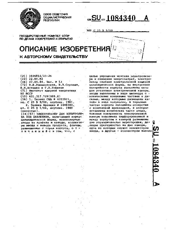 Электролизер для электролиза под давлением / Романовский В. В., Сорокин В. Н., Асташко В. И., Новиков Г. И.; заявитель : Институт ядерной энергетики АН БССР // Описания изобретений (ретрофонд) / Комитет по патентам и товарным знакам России. – М. — (Патенты России)., 2003. – 1984, № 1. — Загл. с титул. экрана. — Систем. требования: Acrobat Reader. — Режим доступа: ftp://smolensklib.ru/bd/patent_ru/pt1084340.pdf. — <URL:ftp://smolensklib.ru/bd/patent_ru/pt1084340.pdf>.
