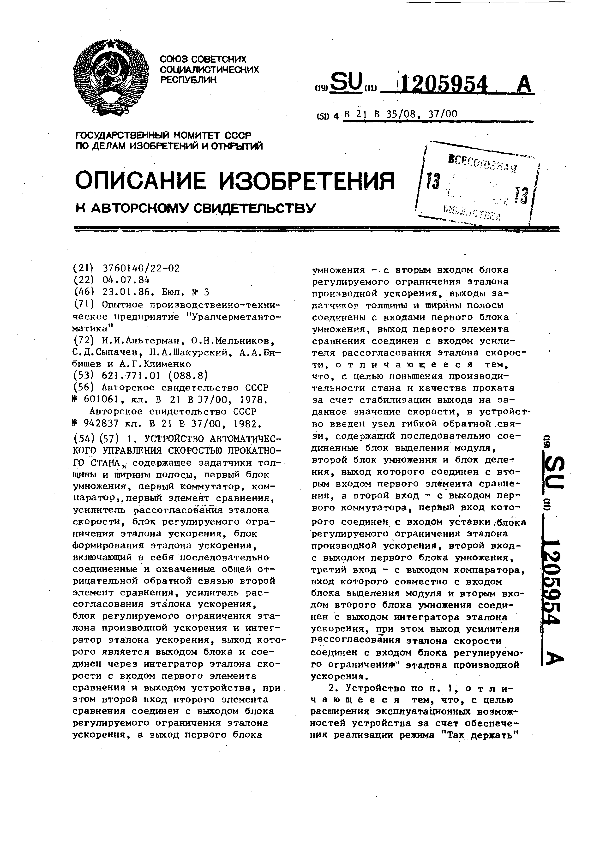 Устройство автоматического управления скоростью прокатного стана / Альтерман И. И., Мельников О. Н., Сыпачев С. Д. [и др.]; заявитель: Опытное производственно-техническое предприятие "Уралчерметавтоматика" // Описания изобретений (ретрофонд) / Комитет по патентам и товарным знакам России. – М., 2003. – 1986, № 1. — (Патенты России). — Загл. с титул. экрана. — Поисковая система: ИПС MIMOSA GTI. — Систем. требования: Acrobat Reader. — Режим доступа: ftp://smolensklib.ru/bd/patent_ru/pt1205954.pdf. — <URL:ftp://smolensklib.ru/bd/patent_ru/pt1205954.pdf>.