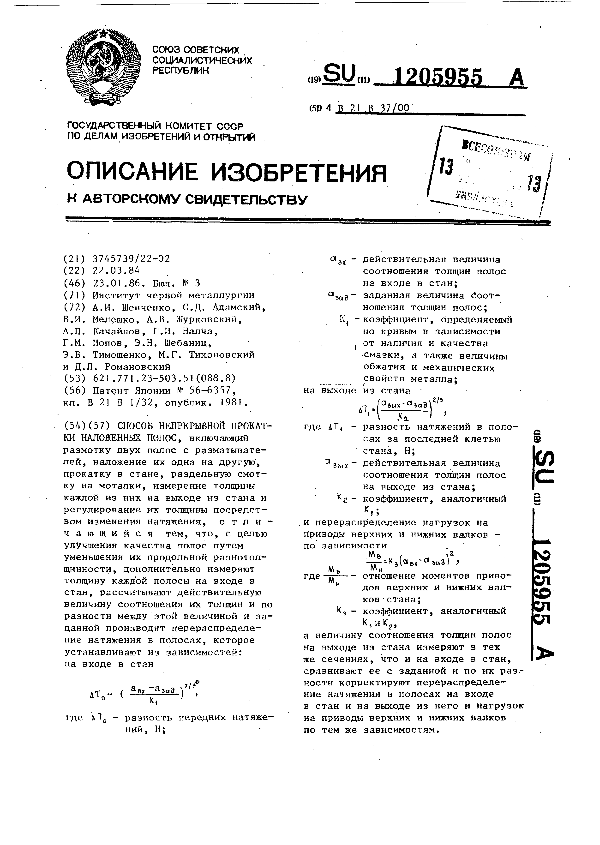 Способ непрерывной прокатки наложенных полос / Шевченко А. И., Адамский С. Д., Мелешко В. И. [и др.]; заявитель: Институт черной металлургии // Описания изобретений (ретрофонд) / Комитет по патентам и товарным знакам России. – М., 2003. – 1986, № 1. — (Патенты России). — Загл. с титул. экрана. — Поисковая система: ИПС MIMOSA GTI. — Систем. требования: Acrobat Reader. — Режим доступа: ftp://smolensklib.ru/bd/patent_ru/pt1205955.pdf. — <URL:ftp://smolensklib.ru/bd/patent_ru/pt1205955.pdf>.