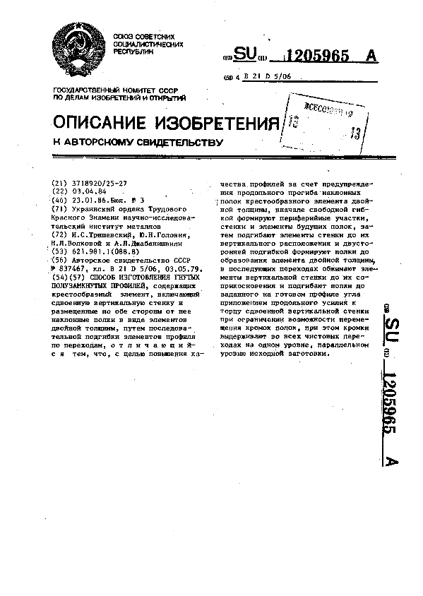 Способ изготовления гнутых полузамкнутых профилей / Тришевский И. С., Головня Ю. Н., Волковой Н. Л. [и др.]; заявитель: Украинский ордена Трудового Красного Знамени научно-исследовательский институт металлов // Описания изобретений (ретрофонд) / Комитет по патентам и товарным знакам России. – М., 2003. – 1986, № 1. — (Патенты России). — Загл. с титул. экрана. — Поисковая система: ИПС MIMOSA GTI. — Систем. требования: Acrobat Reader. — Режим доступа: ftp://smolensklib.ru/bd/patent_ru/pt1205965.pdf. — <URL:ftp://smolensklib.ru/bd/patent_ru/pt1205965.pdf>.