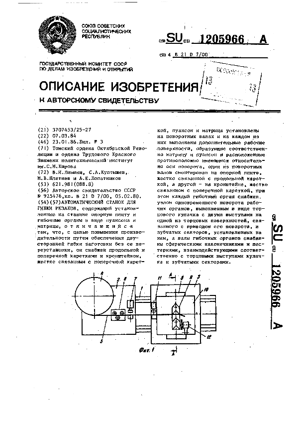 Автоматический станок для гибки резаков / Лившиц В. И., Култышев С. А., Плетнев М. В. [и др.]; заявитель: Томский ордена Октябрьской Революции и ордена Трудового Красного Знамени политехнический институт им.С. М. Кирова // Описания изобретений (ретрофонд) / Комитет по патентам и товарным знакам России. – М., 2003. – 1986, № 1. — (Патенты России). — Загл. с титул. экрана. — Поисковая система: ИПС MIMOSA GTI. — Систем. требования: Acrobat Reader. — Режим доступа: ftp://smolensklib.ru/bd/patent_ru/pt1205966.pdf. — <URL:ftp://smolensklib.ru/bd/patent_ru/pt1205966.pdf>.