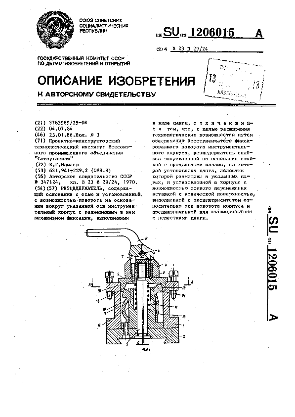 Резцедержатель / Мамаев В. Г.; заявитель: Проектно-конструкторский технологический институт Всесоюзного промышленного объединения "Союзуглемаш" // Описания изобретений (ретрофонд) / Комитет по патентам и товарным знакам России. – М., 2003. – 1986, № 1. — (Патенты России). — Загл. с титул. экрана. — Систем. требования: Acrobat Reader. — Режим доступа: ftp://smolensklib.ru/bd/patent_ru/pt1206015.pdf. — <URL:ftp://smolensklib.ru/bd/patent_ru/pt1206015.pdf>.
