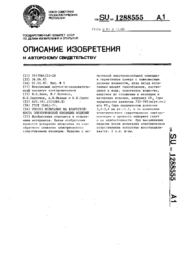 Способ испытания на влагостойкость электрической изоляции изделий / Заев Н. Е., Поляков Н. Г., Каплунов И. Я. [и др.]; заявитель: Всесоюзный научно-исследовательский институт электромеханики // Описания изобретений (ретрофонд) / Комитет по патентам и товарным знакам России. – М., 2003. – 1987, № 1. — (Патенты России). — Загл. с титул. экрана. — Поисковая система: MIMOSA GTI. — Систем. требования: Acrobat Reader. — Режим доступа: ftp://smolensklib.ru/bd/patent_ru/pt1288555.pdf. — <URL:ftp://smolensklib.ru/bd/patent_ru/pt1288555.pdf>.