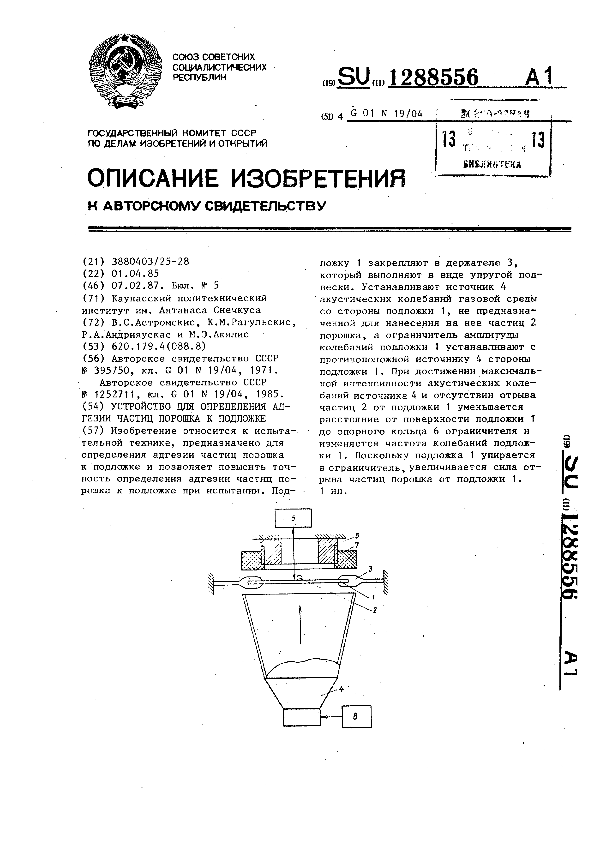 Устройство для определения адгезии частиц порошка к подложке / Астромскис В. С., Рагульскис К. М., Андрияускас Р. А., Акялис М. Э.; заявитель: Каунасский политехнический институт им. Антанаса Снечкуса // Описания изобретений (ретрофонд) / Комитет по патентам и товарным знакам России. – М., 2003. – 1987, № 1. — (Патенты России). — Загл. с титул. экрана. — Поисковая система: MIMOSA GTI. — Систем. требования: Acrobat Reader. — Режим доступа: ftp://smolensklib.ru/bd/patent_ru/pt1288556.pdf. — <URL:ftp://smolensklib.ru/bd/patent_ru/pt1288556.pdf>.