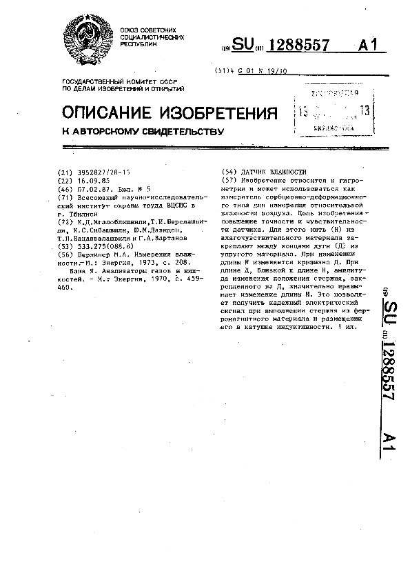 Датчик влажности / Мгалоблишвили К. Д., Берелашвили Т. И., Сибашвили К. С. [и др.]; заявитель: Всесоюзный научно-исследовательский институт охраны труда ВЦСПС в г. Тбилиси // Описания изобретений (ретрофонд) / Комитет по патентам и товарным знакам России. – М., 2003. – 1987, № 1. — (Патенты России). — Загл. с титул. экрана. — Поисковая система: MIMOSA GTI. — Систем. требования: Acrobat Reader. — Режим доступа: ftp://smolensklib.ru/bd/patent_ru/pt1288557.pdf. — <URL:ftp://smolensklib.ru/bd/patent_ru/pt1288557.pdf>.