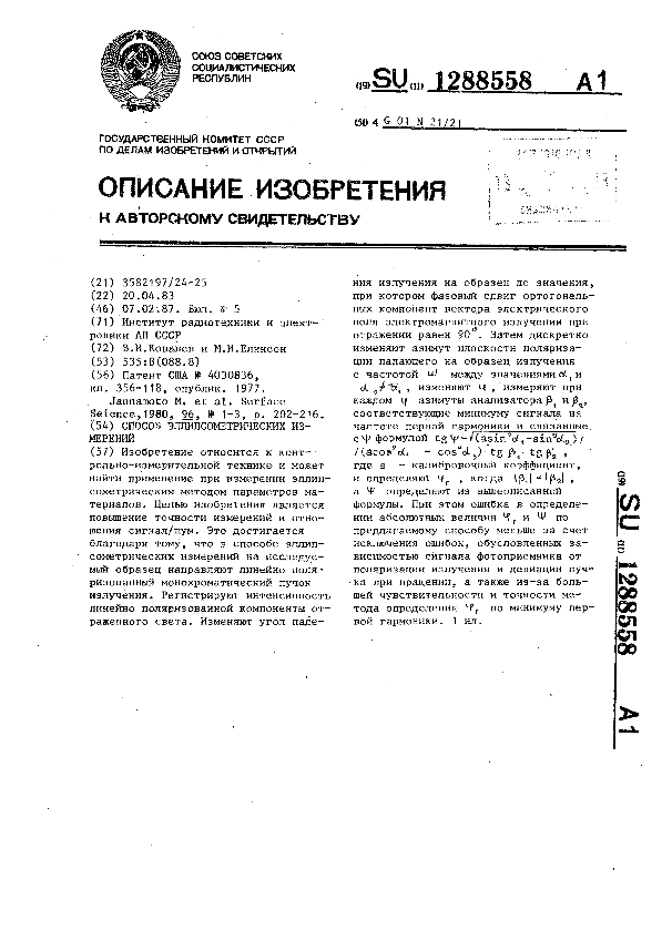 Способ эллипсометрических измерений / Ковалев В. И., Елинсон М. И.; заявитель: Институт радиотехники и электроники АН СССР // Описания изобретений (ретрофонд) / Комитет по патентам и товарным знакам России. – М., 2003. – 1987, № 1. — (Патенты России). — Загл. с титул. экрана. — Поисковая система: MIMOSA GTI. — Систем. требования: Acrobat Reader. — Режим доступа: ftp://smolensklib.ru/bd/patent_ru/pt1288558.pdf. — <URL:ftp://smolensklib.ru/bd/patent_ru/pt1288558.pdf>.