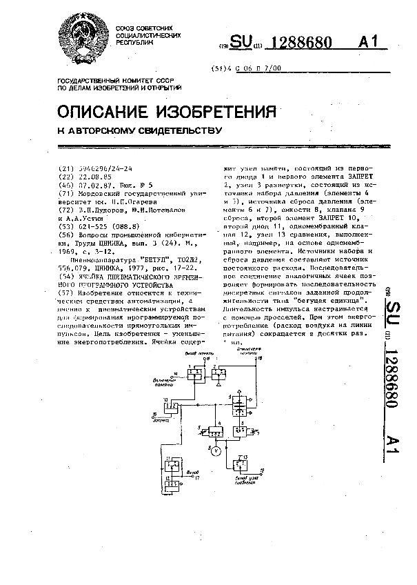 Ячейка пневматического временного программного устройства / Дудоров В. Н., Потепалов Ю. Н., Устин А. А.; заявитель: Мордовский государственный университет им. Н. П. Огарева // Описания изобретений (ретрофонд) / Комитет по патентам и товарным знакам России. – М., 2003. – 1987, № 1. — (Патенты России). — Загл. с титул. экрана. — Систем. требования: Acrobat Reader. — Режим доступа: ftp://smolensklib.ru/bd/patent_ru/pt1288680.pdf. — <URL:ftp://smolensklib.ru/bd/patent_ru/pt1288680.pdf>.