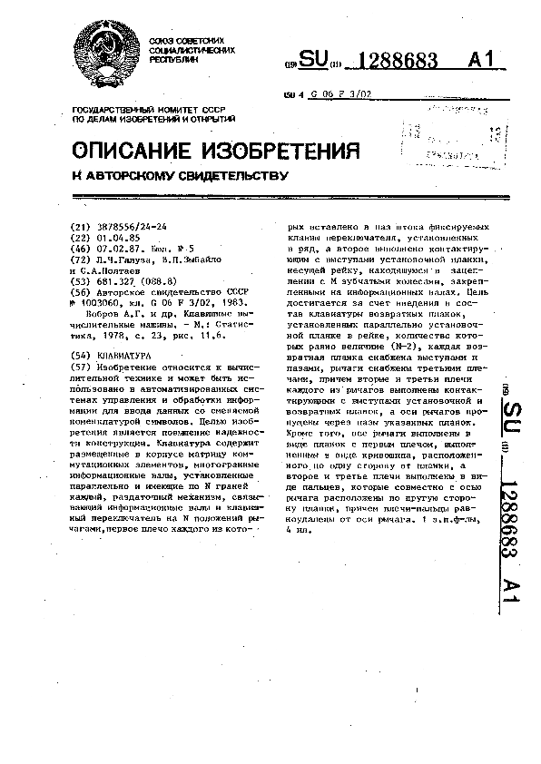 Клавиатура / Галуза Л. Ч., Зыбайло В. П., Полтаев С. А. // Описания изобретений (ретрофонд) / Комитет по патентам и товарным знакам России. – М., 2003. – 1987, № 1. — (Патенты России). — Загл. с титул. экрана. — Систем. требования: Acrobat Reader. — Режим доступа: ftp://smolensklib.ru/bd/patent_ru/pt1288683.pdf. — <URL:ftp://smolensklib.ru/bd/patent_ru/pt1288683.pdf>.
