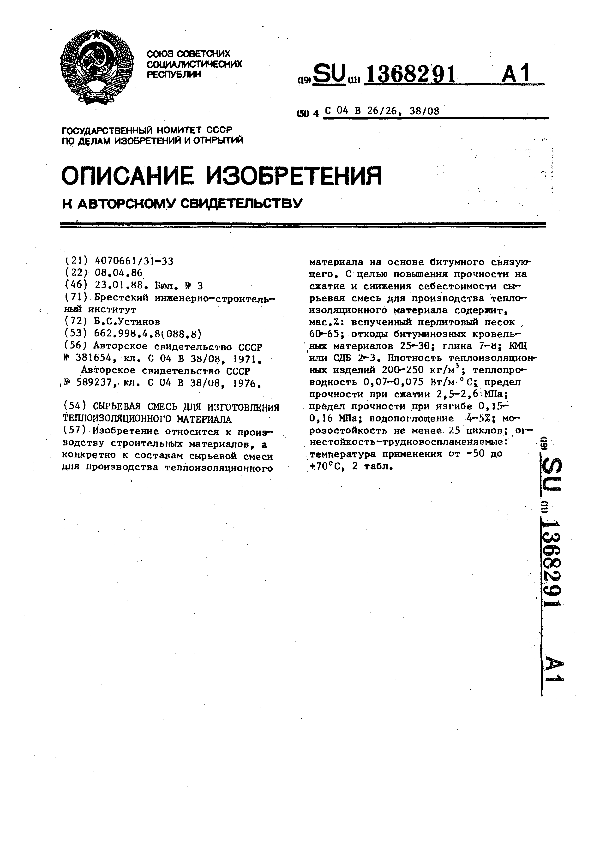 Сырьевая смесь для изготовления теплоизоляционного материала / Устинов Б. С.; заявитель: Брестский инженерно-строительный институт // Описания изобретений (ретрофонд) / Комитет по патентам и товарным знакам России. — М., 1994-____. — (Патенты России). – 1988, № 1. — Загл. с титул. экрана. — Поисковая система: ИПС MIMOSA GTI. — Систем. требования: Acrobat Reader. — Режим доступа: ftp://smolensklib.ru/bd/patent_ru/pt1368291.pdf. — <URL:ftp://smolensklib.ru/bd/patent_ru/pt1368291.pdf>.