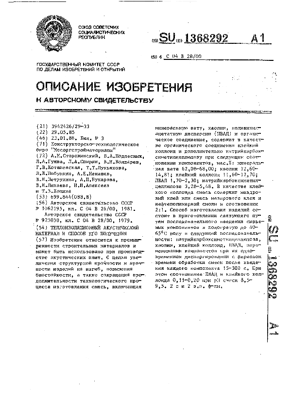 Теплоизоляционный акустический материал и способ его получения / Сторожинский А. М., Подлесных В. А., Гужва Л. А. [и др.]; заявитель: Конструкторско-технологическое бюро "Мосоргстройматериалы" // Описания изобретений (ретрофонд) / Комитет по патентам и товарным знакам России. — М., 1994-____. — (Патенты России). – 1988, № 1. — Загл. с титул. экрана. — Поисковая система: ИПС MIMOSA GTI. — Систем. требования: Acrobat Reader. — Режим доступа: ftp://smolensklib.ru/bd/patent_ru/pt1368292.pdf. — <URL:ftp://smolensklib.ru/bd/patent_ru/pt1368292.pdf>.