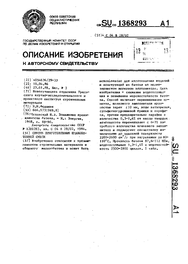 Способ приготовления шлакобетонной смеси / Федынин Н. И.; заявитель: Новокузнецкое отделение Уральского научно-исследовательского и проектного института строительных материалов // Описания изобретений (ретрофонд) / Комитет по патентам и товарным знакам России. — М., 1994-____. — (Патенты России). – 1988, № 1. — Загл. с титул. экрана. — Поисковая система: ИПС MIMOSA GTI. — Систем. требования: Acrobat Reader. — Режим доступа: ftp://smolensklib.ru/bd/patent_ru/pt1368293.pdf. — <URL:ftp://smolensklib.ru/bd/patent_ru/pt1368293.pdf>.