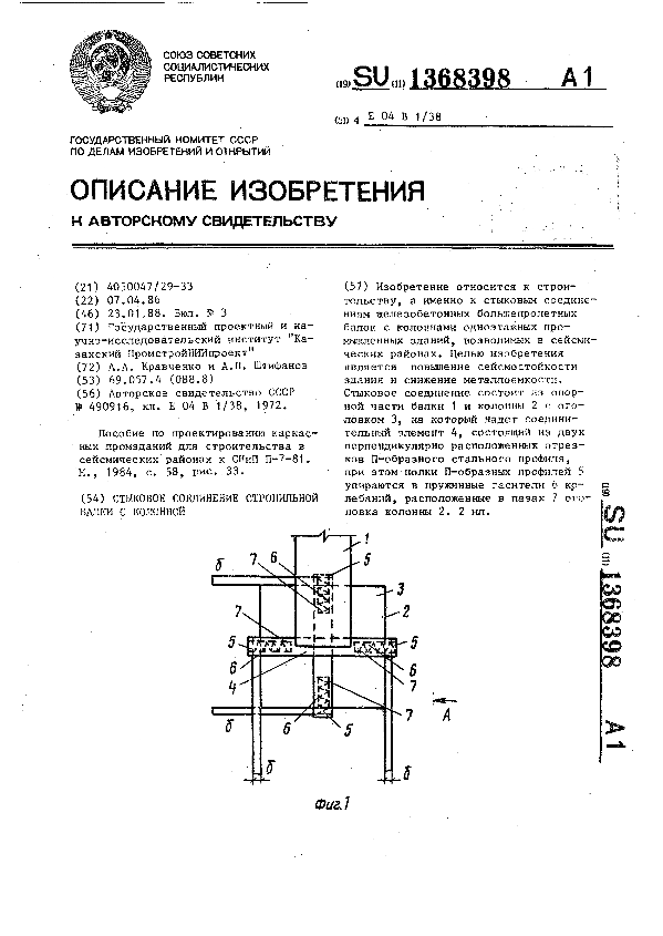 Стыковое соединение стропильной балки с колонной / Кравченко А. А., Штифанов А. П.; заявитель: Государственный проектный и научно-исследовательский институт "Казахский ПромстройНИИпроект" // Описания изобретений (ретрофонд) / Комитет по патентам и товарным знакам России. — М., 1994-____. — (Патенты России). – 1988, № 1. — Загл. с титул. экрана. — Поисковая система: ИПС MIMOSA GTI. — Систем. требования: Acrobat Reader. — Режим доступа: ftp://smolensklib.ru/bd/patent_ru/pt1368398.pdf. — <URL:ftp://smolensklib.ru/bd/patent_ru/pt1368398.pdf>.