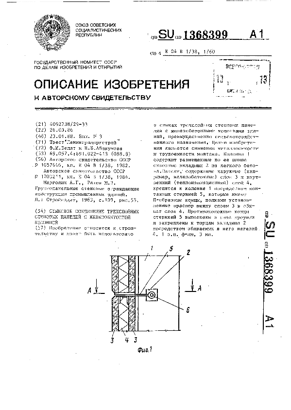 Стыковое соединение трехслойных стеновых панелей с железобетонной колонной / Белят Ф. И., Абакумова Н. Б.; заявитель: Трест «Ленинградоргстрой» // Описания изобретений (ретрофонд) / Комитет по патентам и товарным знакам России. — М., 1994-____. — (Патенты России). – 1988, № 1. — Загл. с титул. экрана. — Поисковая система: ИПС MIMOSA GTI. — Систем. требования: Acrobat Reader. — Режим доступа: ftp://smolensklib.ru/bd/patent_ru/pt1368399.pdf. — <URL:ftp://smolensklib.ru/bd/patent_ru/pt1368399.pdf>.