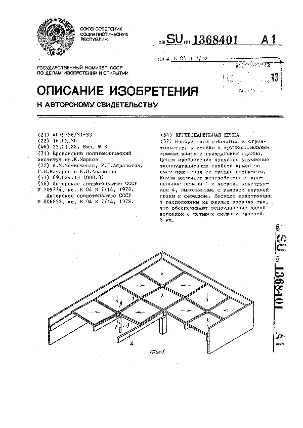Крупнопанельная крыша / Мамиджанян А. М., Айрапетян Р. Г., Назарян Г. Б., Аванесов К. Л.; заявитель: Ереванский политехнический институт им. К. Маркса // Описания изобретений (ретрофонд) / Комитет по патентам и товарным знакам России. — М., 1994-____. — (Патенты России). – 1988, № 1. — Загл. с титул. экрана. — Поисковая система: ИПС MIMOSA GTI. — Систем. требования: Acrobat Reader. — Режим доступа: ftp://smolensklib.ru/bd/patent_ru/pt1368401.pdf. — <URL:ftp://smolensklib.ru/bd/patent_ru/pt1368401.pdf>.