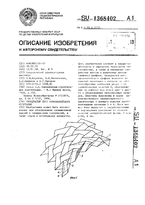 Складчатый лист криволинейного очертания / Коротич А. В., Знаменский В. И., Смирнов А. С., Урицкий В. Г.; заявитель: Свердловский архитектурный институт // Описания изобретений (ретрофонд) / Комитет по патентам и товарным знакам России. — М., 1994-____. — (Патенты России). – 1988, № 1. — Загл. с титул. экрана. — Поисковая система: ИПС MIMOSA GTI. — Систем. требования: Acrobat Reader. — Режим доступа: ftp://smolensklib.ru/bd/patent_ru/pt1368402.pdf. — <URL:ftp://smolensklib.ru/bd/patent_ru/pt1368402.pdf>.
