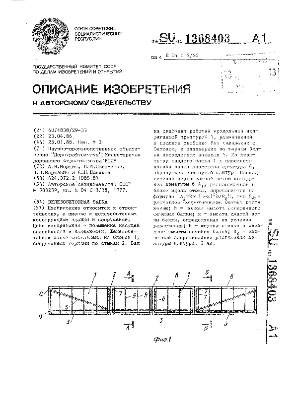 Железобетонная балка / Мордич А. И., Соломатов В. И., Маркевич Н. Н., Поляков А. Л.; заявитель: Научно-производственное объединение "Дорстройтехника" Министерства дорожного строительства БССР // Описания изобретений (ретрофонд) / Комитет по патентам и товарным знакам России. — М., 1994-____. — (Патенты России). – 1988, № 1. — Загл. с титул. экрана. — Поисковая система: ИПС MIMOSA GTI. — Систем. требования: Acrobat Reader. — Режим доступа: ftp://smolensklib.ru/bd/patent_ru/pt1368403.pdf. — <URL:ftp://smolensklib.ru/bd/patent_ru/pt1368403.pdf>.