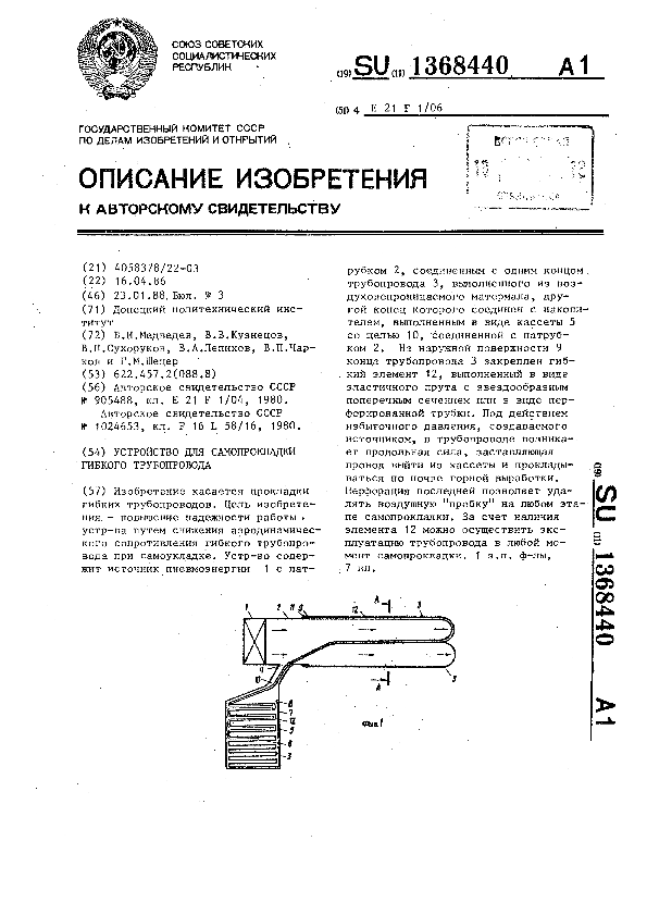 Устройство для самопрокладки гибкого трубопровода / Медведев Б. И., Кузнецов В. В., Сухоруков В. П. [и др.]; заявитель: Донецкий политехнический институт // Описания изобретений (ретрофонд) / Комитет по патентам и товарным знакам России. — М., 1994-____. — (Патенты России). – 1988, № 1. — Загл. с титул. экрана. — Поисковая система: ИПС MIMOSA GTI. — Систем. требования: Acrobat Reader. — Режим доступа: ftp://smolensklib.ru/bd/patent_ru/pt1368440.pdf. — <URL:ftp://smolensklib.ru/bd/patent_ru/pt1368440.pdf>.