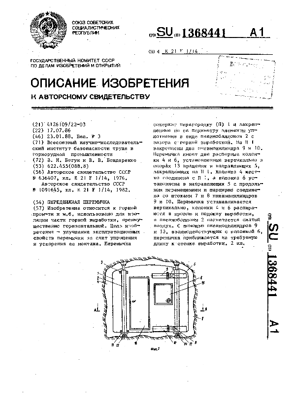 Передвижная перемычка / Бегун В. И., Бондаренко В. В.; заявитель: Всесоюзный научно-исследовательский институт безопасности труда в горнорудной промышленности // Описания изобретений (ретрофонд) / Комитет по патентам и товарным знакам России. — М., 1994-____. — (Патенты России). – 1988, № 1. — Загл. с титул. экрана. — Поисковая система: ИПС MIMOSA GTI. — Систем. требования: Acrobat Reader. — Режим доступа: ftp://smolensklib.ru/bd/patent_ru/pt1368441.pdf. — <URL:ftp://smolensklib.ru/bd/patent_ru/pt1368441.pdf>.