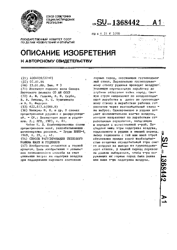 Способ регулирования теплового режима шахт и рудников / Галкин А. Ф., Скуба В. Н., Аникин В. В. [и др.]; заявитель: Институт горного дела Севера Якутского филиала СО АН СССР // Описания изобретений (ретрофонд) / Комитет по патентам и товарным знакам России. — М., 1994-____. — (Патенты России). – 1988, № 1. — Загл. с титул. экрана. — Поисковая система: ИПС MIMOSA GTI. — Систем. требования: Acrobat Reader. — Режим доступа: ftp://smolensklib.ru/bd/patent_ru/pt1368442.pdf. — <URL:ftp://smolensklib.ru/bd/patent_ru/pt1368442.pdf>.
