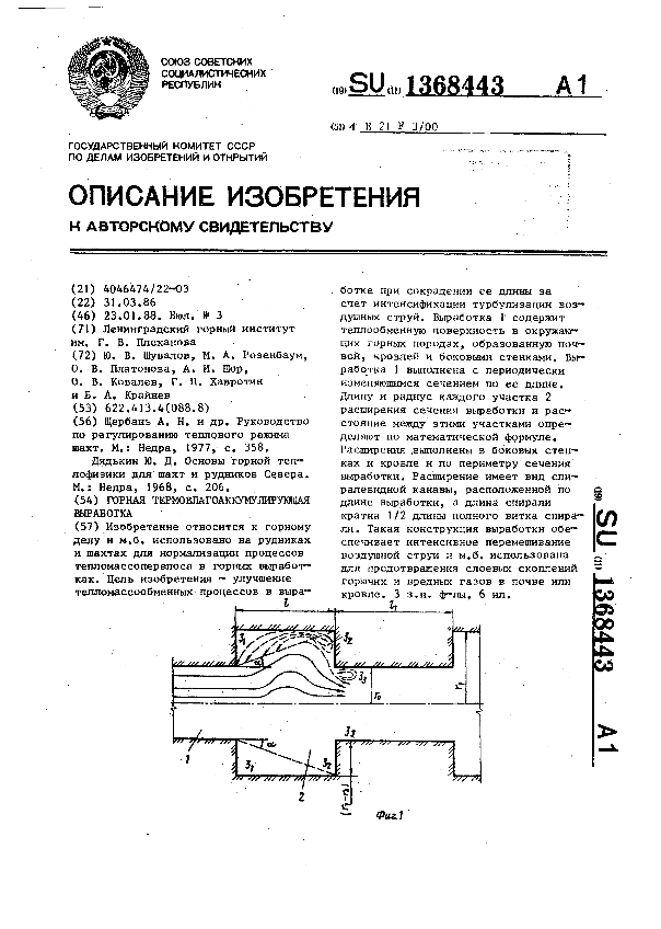 Горная термовлагоаккумулирующая выработка / Шувалов Ю. В., Розенбаум М. А., Платонова О. В. [и др.]; заявитель: Ленинградский горный институт им. Г. В. Плеханова // Описания изобретений (ретрофонд) / Комитет по патентам и товарным знакам России. — М., 1994-____. — (Патенты России). – 1988, № 1. — Загл. с титул. экрана. — Поисковая система: ИПС MIMOSA GTI. — Систем. требования: Acrobat Reader. — Режим доступа: ftp://smolensklib.ru/bd/patent_ru/pt1368443.pdf. — <URL:ftp://smolensklib.ru/bd/patent_ru/pt1368443.pdf>.