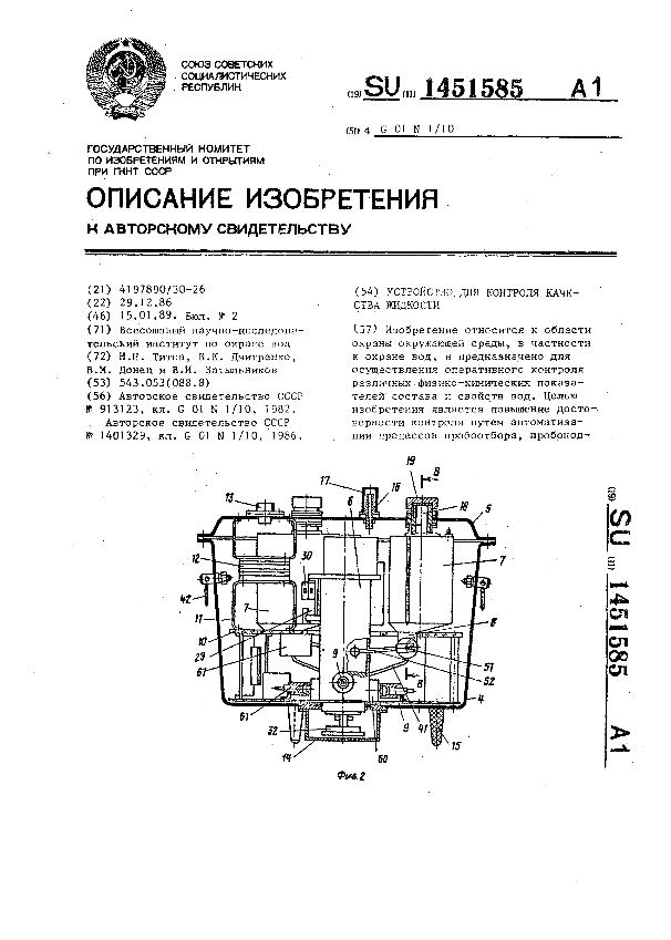 Устройство для контроля качества жидкости / Титов Н. Н., Дмитренко В. К., Донец В. М., Затыльников В. И.; заявитель: Всесоюзный научно-исследовательский институт по охране вод // Описания изобретений (ретрофонд) / Комитет по патентам и товарным знакам России. – М., 2003. – 1989, № 1. — (Патенты России). — Загл. с титул. экрана. — Поисковая система: ИПС MIMOSA GTI. — Систем. требования: Acrobat Reader. — Режим доступа: ftp://smolensklib.ru/bd/patent_ru/pt1451585.pdf. — <URL:ftp://smolensklib.ru/bd/patent_ru/pt1451585.pdf>.