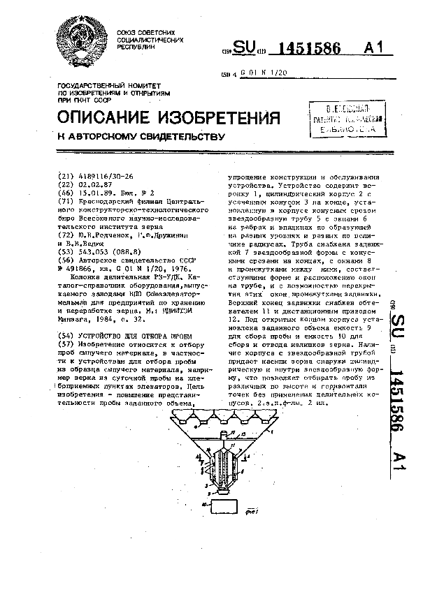 Устройство для отбора пробы / Родченок Ю. В., Дружинин Г. Ф., Бедюх В. В.; заявитель: Краснодарский филиал Центрального конструкторско-технологического бюро Всесоюзного научно-исследовательского института зерна // Описания изобретений (ретрофонд) / Комитет по патентам и товарным знакам России. – М., 2003. – 1989, № 1. — (Патенты России). — Загл. с титул. экрана. — Поисковая система: ИПС MIMOSA GTI. — Систем. требования: Acrobat Reader. — Режим доступа: ftp://smolensklib.ru/bd/patent_ru/pt1451586.pdf. — <URL:ftp://smolensklib.ru/bd/patent_ru/pt1451586.pdf>.