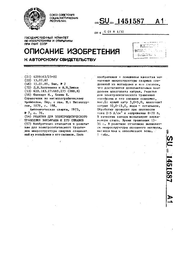 Реактив для электролитического травления вольфрама и его сплавов / Колупаева Д. И., Дешин Н. Н. // Описания изобретений (ретрофонд) / Комитет по патентам и товарным знакам России. – М., 2003. – 1989, № 1. — (Патенты России). — Загл. с титул. экрана. — Поисковая система: ИПС MIMOSA GTI. — Систем. требования: Acrobat Reader. — Режим доступа: ftp://smolensklib.ru/bd/patent_ru/pt1451587.pdf. — <URL:ftp://smolensklib.ru/bd/patent_ru/pt1451587.pdf>.