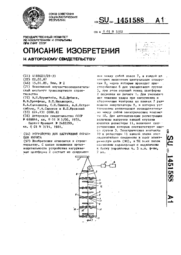 Устройство для нагружения образцов грунта / Бурнштейн В. Л., Дубнов Ю. Д., Бронфман Б. В. [и др.]; заявитель: Всесоюзный научно-исследовательский институт транспортного строительства // Описания изобретений (ретрофонд) / Комитет по патентам и товарным знакам России. – М., 2003. – 1989, № 1. — (Патенты России). — Загл. с титул. экрана. — Поисковая система: ИПС MIMOSA GTI. — Систем. требования: Acrobat Reader. — Режим доступа: ftp://smolensklib.ru/bd/patent_ru/pt1451588.pdf. — <URL:ftp://smolensklib.ru/bd/patent_ru/pt1451588.pdf>.