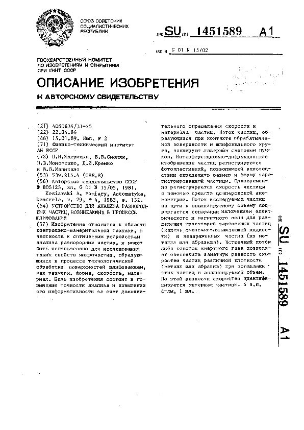 Устройство для анализа разнородных частиц, возникающих в процессе шлифования / Ящерицын П. И., Смоляк В. В., Моисеенко П. В. [и др.]; заявитель: Физико-технический институт АН БССР // Описания изобретений (ретрофонд) / Комитет по патентам и товарным знакам России. – М., 2003. – 1989, № 1. — (Патенты России). — Загл. с титул. экрана. — Поисковая система: ИПС MIMOSA GTI. — Систем. требования: Acrobat Reader. — Режим доступа: ftp://smolensklib.ru/bd/patent_ru/pt1451589.pdf. — <URL:ftp://smolensklib.ru/bd/patent_ru/pt1451589.pdf>.