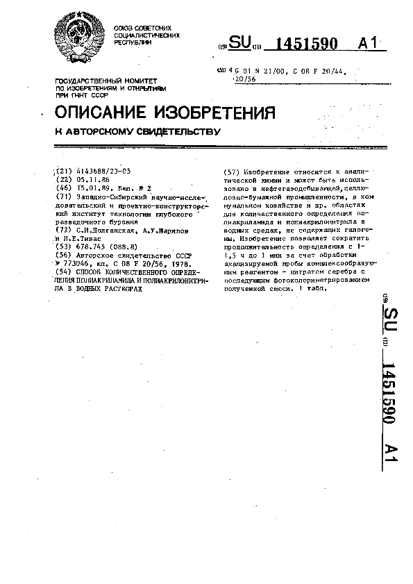 Способ количественного определения полиакриламида и полиакрилонитрила в водных растворах / Долганская С. И., Шарипов А. У., Тивас Н. Е.; заявитель: Западно-Сибирский научно-исследовательский и проектно-конструкторский институт технологии глубокого разведочного бурения // Описания изобретений (ретрофонд) / Комитет по патентам и товарным знакам России. – М., 2003. – 1989, № 1. — (Патенты России). — Загл. с титул. экрана. — Поисковая система: ИПС MIMOSA GTI. — Систем. требования: Acrobat Reader. — Режим доступа: ftp://smolensklib.ru/bd/patent_ru/pt1451590.pdf. — <URL:ftp://smolensklib.ru/bd/patent_ru/pt1451590.pdf>.