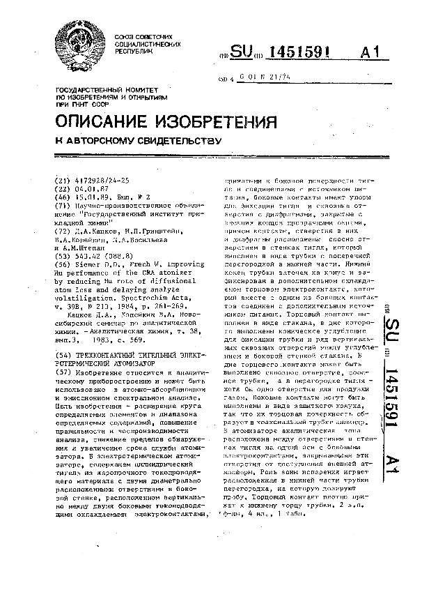 Трехконтактный тигельный электротермический атомизатор / Кацков Д. А., Гринштейн И. Л., Копейкин В. А. [и др.]; заявитель: Научно-производственное объединение "Государственный институт прикладной химии" // Описания изобретений (ретрофонд) / Комитет по патентам и товарным знакам России. – М., 2003. – 1989, № 1. — (Патенты России). — Загл. с титул. экрана. — Поисковая система: ИПС MIMOSA GTI. — Систем. требования: Acrobat Reader. — Режим доступа: ftp://smolensklib.ru/bd/patent_ru/pt1451591.pdf. — <URL:ftp://smolensklib.ru/bd/patent_ru/pt1451591.pdf>.