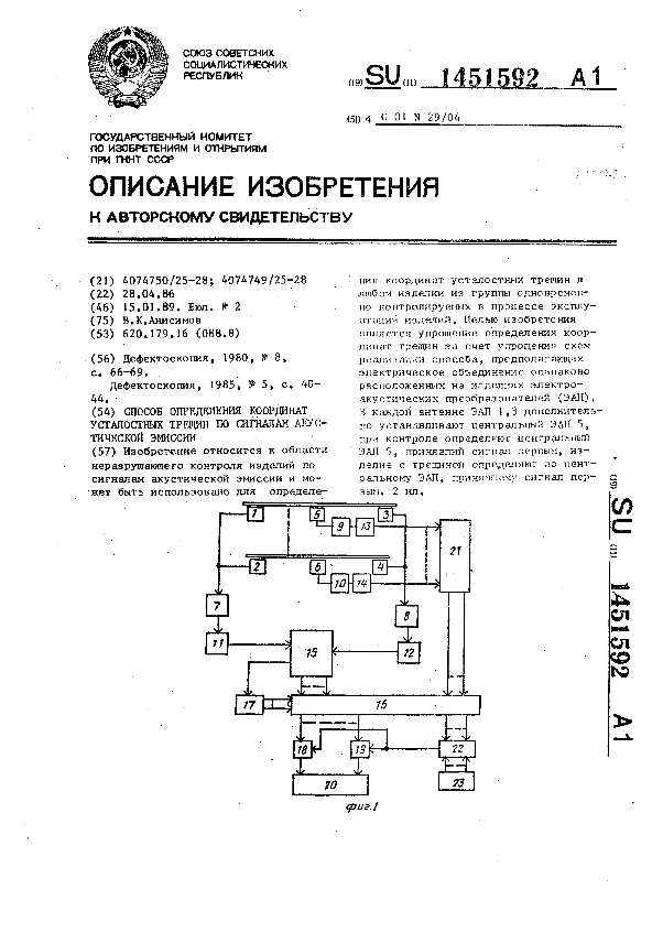 Способ определения координат усталостных трещин по сигналам акустической эмиссии / Анисимов В. К. // Описания изобретений (ретрофонд) / Комитет по патентам и товарным знакам России. – М., 2003. – 1989, № 1. — (Патенты России). — Загл. с титул. экрана. — Поисковая система: ИПС MIMOSA GTI. — Систем. требования: Acrobat Reader. — Режим доступа: ftp://smolensklib.ru/bd/patent_ru/pt1451592.pdf. — <URL:ftp://smolensklib.ru/bd/patent_ru/pt1451592.pdf>.