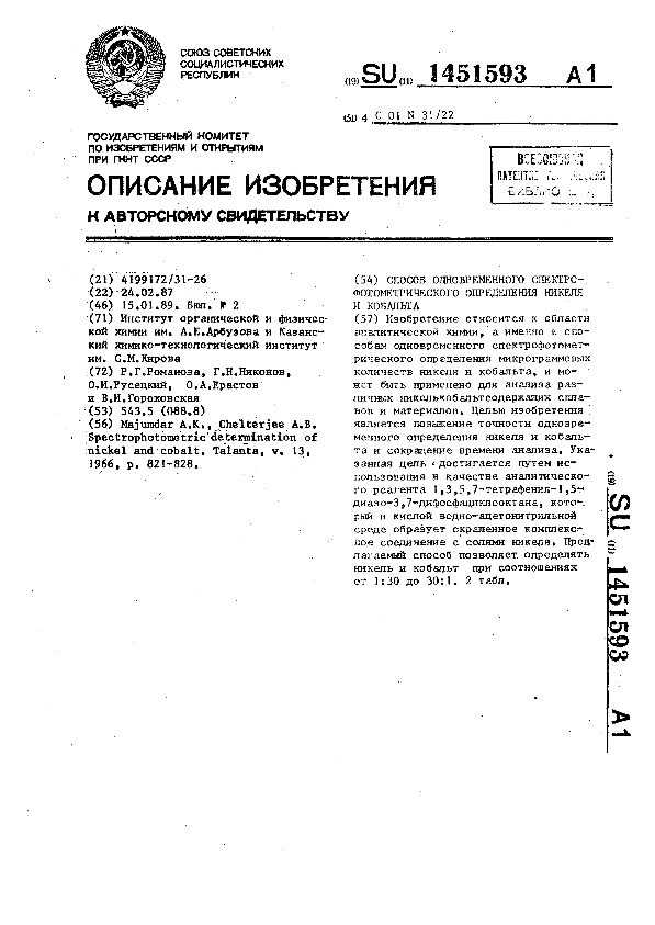 Способ одновременного спектрофотометрического определения никеля и кобальта / Романова Р. Г., Никонов Г. Н., Русецкий О. И. [и др.]; заявитель: Институт органической и физической химии им. А. Е. Арбузова и Казанский химико-технологический институт им. С.М. Кирова // Описания изобретений (ретрофонд) / Комитет по патентам и товарным знакам России. – М., 2003. – 1989, № 1. — (Патенты России). — Загл. с титул. экрана. — Поисковая система: ИПС MIMOSA GTI. — Систем. требования: Acrobat Reader. — Режим доступа: ftp://smolensklib.ru/bd/patent_ru/pt1451593.pdf. — <URL:ftp://smolensklib.ru/bd/patent_ru/pt1451593.pdf>.