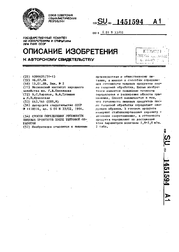 Способ определения готовности пищевых продуктов после тепловой обработки / Баранов В. С., Тупицын В. А., Жуковская Л. П.; заявитель: Московский институт народного хозяйства им. Г. В. Плеханова // Описания изобретений (ретрофонд) / Комитет по патентам и товарным знакам России. – М., 2003. – 1989, № 1. — (Патенты России). — Загл. с титул. экрана. — Поисковая система: ИПС MIMOSA GTI. — Систем. требования: Acrobat Reader. — Режим доступа: ftp://smolensklib.ru/bd/patent_ru/pt1451594.pdf. — <URL:ftp://smolensklib.ru/bd/patent_ru/pt1451594.pdf>.