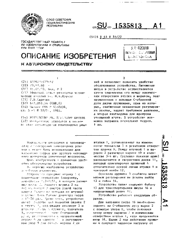 Устройство для натяжения шнуров / Саргаев Г. П.; заявитель: Уфимский завод резиновых технических изделий им. М. В. Фрунзе // Описания изобретений (ретрофонд) / Комитет по патентам и товарным знакам России. – М., 2003. – 1990, 1. — (Патенты России). — Загл. с титул. экрана. — Поисковая система: MIMOSA GTI. — Систем. требования: Acrobat Reader. — Режим доступа: ftp://smolensklib.ru/bd/patent_ru/pt1535813.pdf. — <URL:ftp://smolensklib.ru/bd/patent_ru/pt1535813.pdf>.