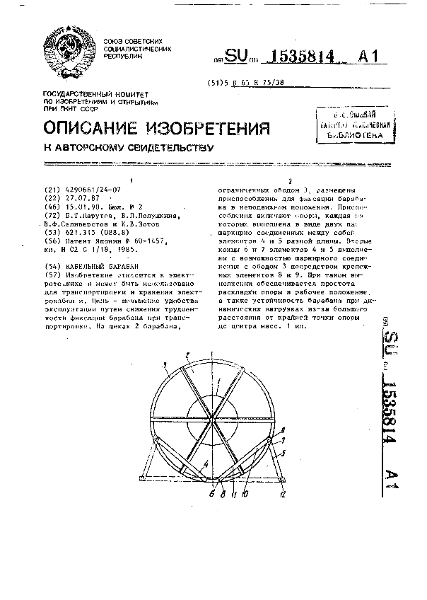 Кабельный барабан / Парутов Б. Т., Полушкина В. П., Селиверстов В. Ф., Зотов К. В. // Описания изобретений (ретрофонд) / Комитет по патентам и товарным знакам России. – М., 2003. – 1990, 1. — (Патенты России). — Загл. с титул. экрана. — Поисковая система: MIMOSA GTI. — Систем. требования: Acrobat Reader. — Режим доступа: ftp://smolensklib.ru/bd/patent_ru/pt1535814.pdf. — <URL:ftp://smolensklib.ru/bd/patent_ru/pt1535814.pdf>.