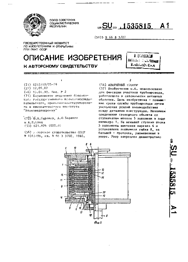 Аварийный стопор / Баранов Ю. А., Баранов А. Ю., Швец А. Я.; заявитель: Харьковское отделение Всесоюзного государственного научно-исследовательского, проектно-конструкторского и изыскательского института "Атомэнергопроект" // Описания изобретений (ретрофонд) / Комитет по патентам и товарным знакам России. – М., 2003. – 1990, 1. — (Патенты России). — Загл. с титул. экрана. — Поисковая система: MIMOSA GTI. — Систем. требования: Acrobat Reader. — Режим доступа: ftp://smolensklib.ru/bd/patent_ru/pt1535815.pdf. — <URL:ftp://smolensklib.ru/bd/patent_ru/pt1535815.pdf>.