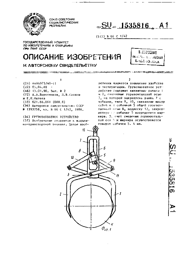Грузозахватное устройство / Воротников А. А., Соснов Л. В., Фатеев Е. Н. // Описания изобретений (ретрофонд) / Комитет по патентам и товарным знакам России. – М., 2003. – 1990, 1. — (Патенты России). — Загл. с титул. экрана. — Поисковая система: MIMOSA GTI. — Систем. требования: Acrobat Reader. — Режим доступа: ftp://smolensklib.ru/bd/patent_ru/pt1535816.pdf. — <URL:ftp://smolensklib.ru/bd/patent_ru/pt1535816.pdf>.
