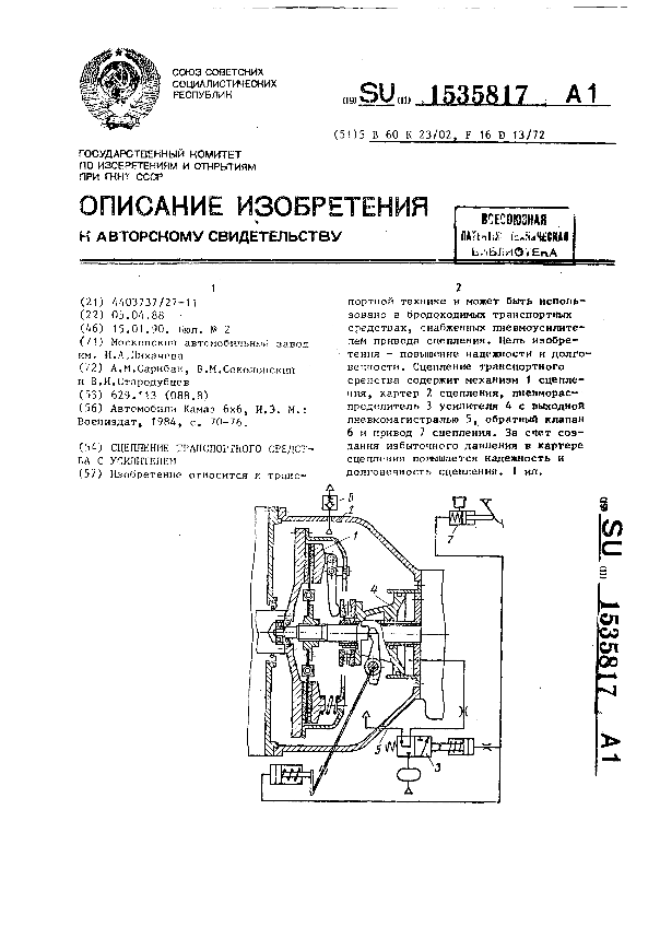 Сцепление транспортного средства с усилителем / Сарибан А. М., Соколовский В. М., Стародубцев В. И.; заявитель: Московский автомобильный завод им. И. А. Лихачева // Описания изобретений (ретрофонд) / Комитет по патентам и товарным знакам России. – М., 2003. – 1990, 1. — (Патенты России). — Загл. с титул. экрана. — Поисковая система: MIMOSA GTI. — Систем. требования: Acrobat Reader. — Режим доступа: ftp://smolensklib.ru/bd/patent_ru/pt1535817.pdf. — <URL:ftp://smolensklib.ru/bd/patent_ru/pt1535817.pdf>.